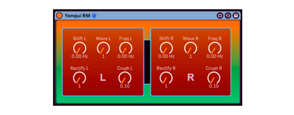 A simple Ring Modulator with shifting parameters and frequency of the modulating wave set separately, a knob to rectify the modulator, a crush for the waves and the respective wave selector that lets you select between sine, saw, square, noise and more. You can set these parameters separately for the left and right channel. |