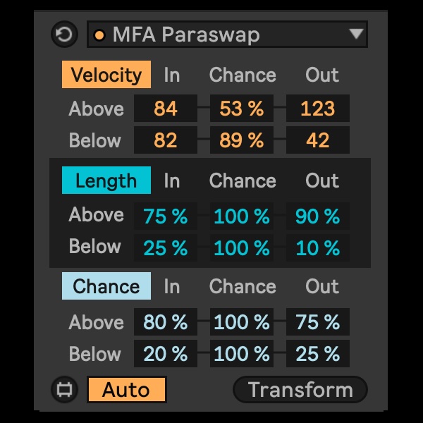 | Description: | Paraswap remaps MIDI note parameters—Velocity, Length, and Chance—based on user-defined thresholds, extending the conceptual framework of Multiswap beyond pitch. For each parameter, values above or below a specified threshold can be probabilistically replaced with new fixed output values, creating multi-band transformations that reshape expressive behavior. This approach allows for precise or unpredictable reinterpretation of MIDI clips, making Paraswap an essential tool for dynamic modulation and generative variation within existing material, while offering a new take on MIDI parameter control. Already comes included with MIDI Toolset 003 and our MIDI Tool Bundle. Requires Live 12.2 running Max 9.x |