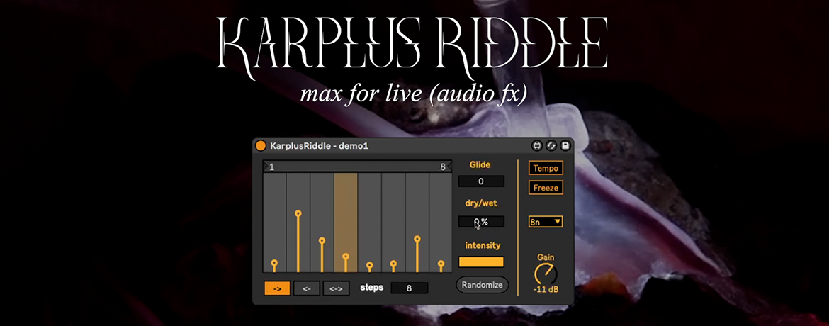 | Description: | Karplus Riddle is a max for live audio effect designed to sculpt rhythmic and evolving plucked or comb-like textures from any sound source. Built around a minimalist step-sequencer, it modulates micro-delay times per step, allowing for dynamic textural shifts, tempo variations, and gliding transitions. Applied to drums, it recalls the metallic, glitchy sonorities of early IDM (Autechre, µ-Ziq, Aphex Twin); with ambient material, it opens up into rich, atonal progressions. Youtube demo: https://www.youtube.com/watch?v=bmMzLeVFweo |