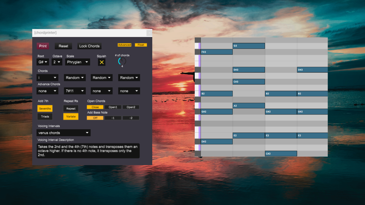 | Description: | “I printed some chords and had a song minutes later... This thing is magical! Chordprinter is a simple yet hugely inspiring tool for songwriters of all styles. Thank you for the Printer Jams!” - Venjent Chordprinter is a Max for Live MIDI device for instant generation of chord progressions. From basic triads to advanced jazzy chords, from root voicing to advanced voicing algorhythms, Chordprinter has it all. Find out in the website link or in the following video: https://www.youtube.com/watch?v=nU7Zcgal8eo |