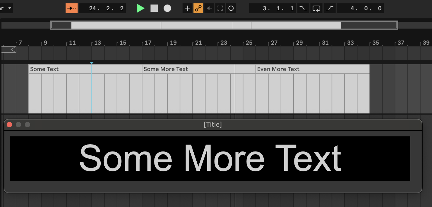 | Description: | Nothing fancy. This device displays the names of MIDI clips on a MIDI track in a floating window. Useful if you want to see titles or written notes when performing live. |