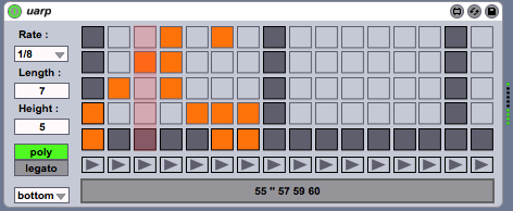 | Description: | uarp is a max for live step arpegiator/sequencer that splits playable notes based on a fixed value (called height) for each steps. This means that if you play more notes than the possible step values, each step will arpegiate within the sequencer. You can also play multiple steps at the same time when it is on the polyphonic mode. This arpegiator within the arpegiator effect is loosely based on the Oberheim OB 8 that limit the number of arpegiated notes to 8. The lower and upper notes will always be played, but you can't predict the middle ones that seems to be played in round-robin. |