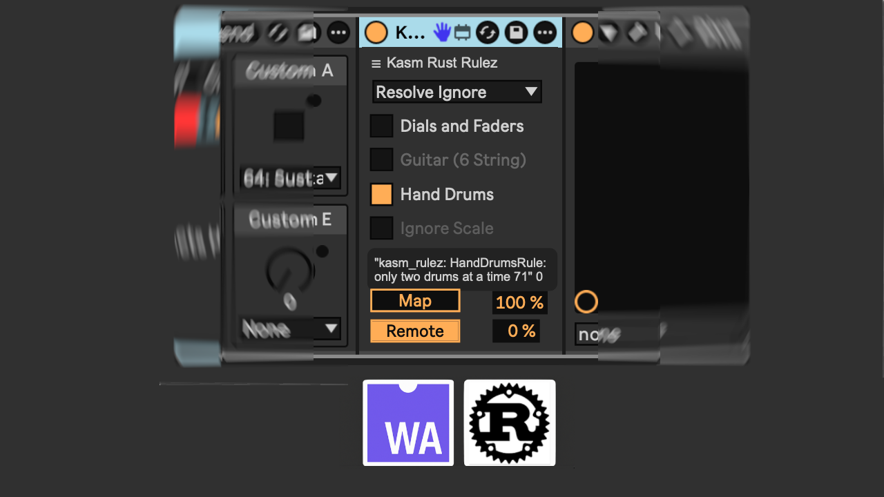 | Description: | Apply real-world rules to virtual instruments! Want to limit your drum rack to bongo-only mode? Make encoder dial twiddling more realistic, smooth things out. This is a demo example of the Kasm Rust/WebAssembly SDK feature that can monitor MIDI data and resolve by filer out note/cc impossibilties. With the SDK you might resolve by delaying the note event slighty, moving to nearest higher or lower note in the detected scale, or use Triggaz Smooth Dial/Faders Rulez: Encoder rotary dials can physically be turned at a maximum rate. Add interpolation steps for anything too fast. Even if a fader slider is flicked, there is still physical time and interpolation of MIDI CC events to trigger depending on the CC data delta. Hand Drums Rulez: Enforce two-hands realism on bongo patterns. On tones requiring one hand to be muting, only one note can be played simultaneously. Restrict physical note repeats to how fast a hand could repeat. Restrict velocity of a hit if the duration is very short; a loud hit needs more hand movement and thus more time. Minimum hit velocity where a sound would actually be heard. Full SDK (disabled in demo) also includes code for: Six-String Guitar Rules: Minimum time between repeated playable notes. Minimum strum time with finger or pick. Lowest pluck where no sound would play. Scale Rules: When scale/key is detected in arpeggiators and emanators, we usually avoid notes that would not fit that scale, maybe we actually want some invalid chaotic chromatic notes. Keyboard Rules: Maximum span in semitones for one hand (e.g., an octave plus white keys). Velocity lower than 10 would not actually cause hammer hitting string/tine. Hand span typical range is octave plus 1 or 2 white keys. Minimum time in ms between one hand position and the next to allow for realistic hand movement, i.e., before a third hand would be needed. Stringed Instrument Rules: Minimum time between plucking the same string again. Don’t allow pizzicato short duration notes at the same time as long-duration bowed notes. Instrument-Specific Rules that are coming: Piano: Key range A0–C9 (the Bösendorfer Imperial has 9 additional low keys!). Violin: Assuming standard GDAE tuning resting play from G3 (open string) to E6 (4th finger on E string). Guitar (6 String): Key range E2–E6, assumes standard EBGADE tuning. Bass (4 String): Key range E1–E5, assumes standard EADG tuning. Cello: Key range C2–C6, assumes standard CGDA tuning. ... but you don't have to wait for us, you can go make your own by grabbing the Kasm SDK here: https://pyrmontbrewery.com/get_kasm Testers of this device get A$15 off of the SDK, in Ableton click the "Kasm Rust" title as shown the image above to get the current coupon code - if you can leave a comment here that's wonderful, but no worries mate Students also get a 30% discount, use KASMSTU at the checkout !! NOTE: you need the latest Ableton 12.2 for this as it uses the new V8 jsinterp from Max9 !! But... if you don't have Max4Live or have an older Ableton Live version no worries - Kasm is WebAssembly so it also runs on a regular web browsers too! You can interface with Ableton via WebMIDI instead, this way you can develop and test with Kasm SDK in Chrome/Firefox, try it out here: https://pyrmontbrewery.com/kasmsdk |