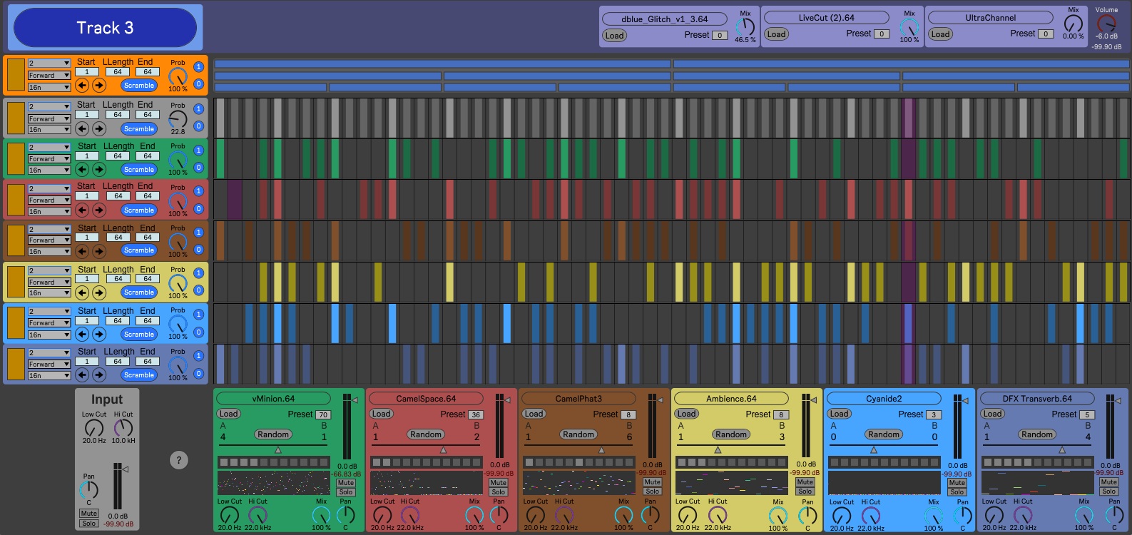 | Description: | Hi Folks, This is the MkII version of my hybridized clone of the classic Illformed/Dblue "Glitch" infernally mated with the Sugarbytes "Effectrix". Its particular, beneficial mutation is that you can load your own vst effects into each slot. I feel like all of it is self explanatory, except for the vst part. Press Load and locate your Vst folder to select a vst/3 (possibly Au?). Click on the vst title bar to view the vst gui. The Preset number selects presets in the vst. Below that is the Snapshot Storage and Morpher. Twiddle the knobs (or press Random) on the vst and Shift+Click on the row of squares to save a Snapshot. Twiddle the knobs some more (or choose another preset) and save another Snapshot. Click on a Snapshot to recall it. The Morph slider morphs between the Snapshots stored in the A and B ends of the slider. Change the numbers at the end of the slider to select the Snapshot loaded there. Below that is a display of all of the vst parameters. Up to 4,096 parameters can be included in a Snapshot. The Preset number, Morph Slider, Snap A and B are all automatable. The horizontal tracks control when incoming audio is gated to the corresponding effect. Each track has 16 sequences with Direction, Interval, Start, Loop Length and End parameters. In addition, you can Shift and Scramble each track. The Prob knob determines the probability of an active step being heard. The 1 and 0 buttons turns all steps on and off respectively. The reason I took down the original is because of the Solo functionality. It works for me now, but maybe thats because I'm currently special. It didn't used to always work. Please let me know if it acts wierd for you. Please let me know about bugs and possible design improvements below. Share and Enjoy!!! Here is an article about the device. Unfortunately, it links to the old version https://lame.buanzo.org/max4live_blog/exploring-malformed-deffectrix-10-for-dynamic-audio-manipulation-in-ableton-live.html |