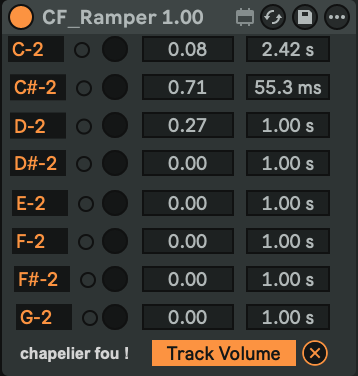 | Description: | Select a parameter to control, then trigger 8 different ramps with their own time and target value with 8 MIDI notes. Useful for fade in, fade out, etc. HOW TO USE : - map to a parameter (like volume of a track) - change this parameter to the target value - click on the little round button to get the target value - repeat on other lanes - use midi notes to trigger these ramps. |