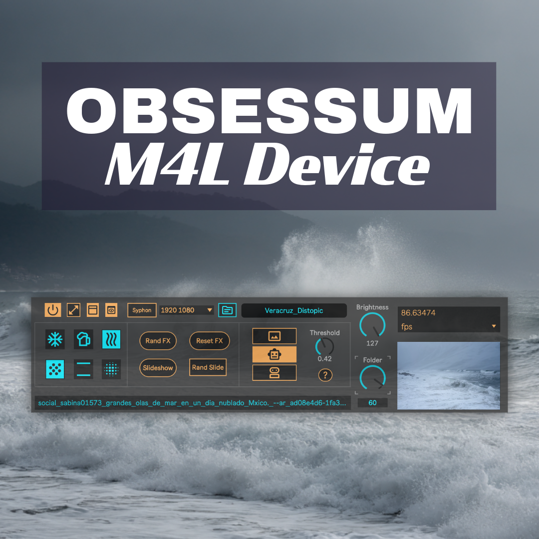 | Description: | Obsessum is a creative Max for Live device that transforms your personal images and video files into music-driven visuals. It reacts in real time to the dynamics of your track, turning amplitude peaks into instant slide changes or video effects. You can let Obsessum generate randomized visual sequences on its own, or take complete control with MIDI mapping for every parameter. This makes it equally powerful for spontaneous live shows and for carefully planned performances where timing matters. In Ableton Live 12, automation allows you to design entire audiovisual pieces inside your project. Just load a folder with .png or .mp4 files, and you’ll be ready to build music videos directly from your session. When used with Syphon, Obsessum easily connects to other software, making it ideal for projection mapping, multi-screen setups, or integrating into a larger VJ workflow. Special 30% OFF Only for Max for Live Website users : M4LOBS30 |