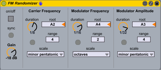 | Description: | I have been using this via ReWire for the last year or so and it was the first project I ported to M4L. It contains code from the "scaler" patch found in the Max 5 application folder (examples/max-tricks/notes-and-pitch) that randomizes based on a chosen scale. What I've done is connect the randomizer to oscillators in a (very) simple FM scheme. You can select the note duration of each osc as well as the scale and range. Turn on Live's transport and away it goes! I usually throw some effects after it like a filter delay and an autopan to soften up the sound a bit. Enjoy! |