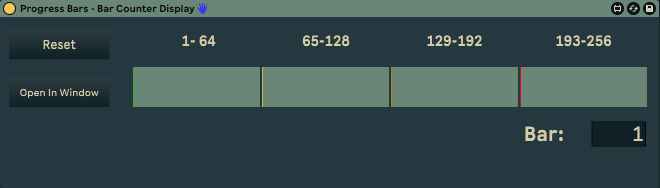 | Description: | A simple device that counts bars and displays progress as 4x 64 bars tied to Ableton Live's clock and transport. The idea is to provide a visual guide for jamming/playing live to help with timing, transitions etc. Resets automatically after 256 bars. Manual reset button to align and button to open the device in a floating window. Everything should work and the device follows Live's themes. If you encounter a bug, please let me know. Exported as audio device, so it can be used on audio and midi tracks. |