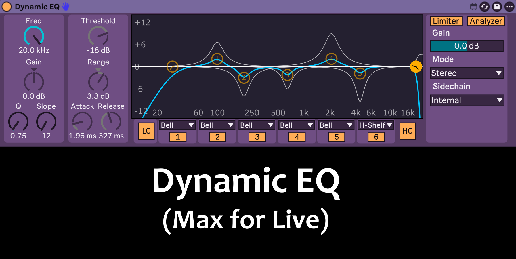 | Description: | Introducing Dynamic EQ https://youtu.be/90Q5BQa71Ws Showcase of how to use Dynamic EQ https://youtu.be/AR9PK8i1b-4 December 2025 Update https://youtu.be/WYkTI9zN8_c Features: 8 bands (2 dedicated low-cut and high-cut + 6 variable-type bands); 3 types of filters (low shelf, bell, high shelf); 3 modes (stereo, left/right, mid/center); 2 types of independent sidechain (internal and external); Configurable slope factor for low-cut and high-cut; Dynamic EQ can do both—compression and expansion; Configurable attack and release times for dynamic EQ; Resonance and frequencies clash detection (ALT+Click); Color mode (CTRL+Click). If you found a bug, please leave a comment (under one of the videos). I will update the device and upload a new version to Gumroad. |