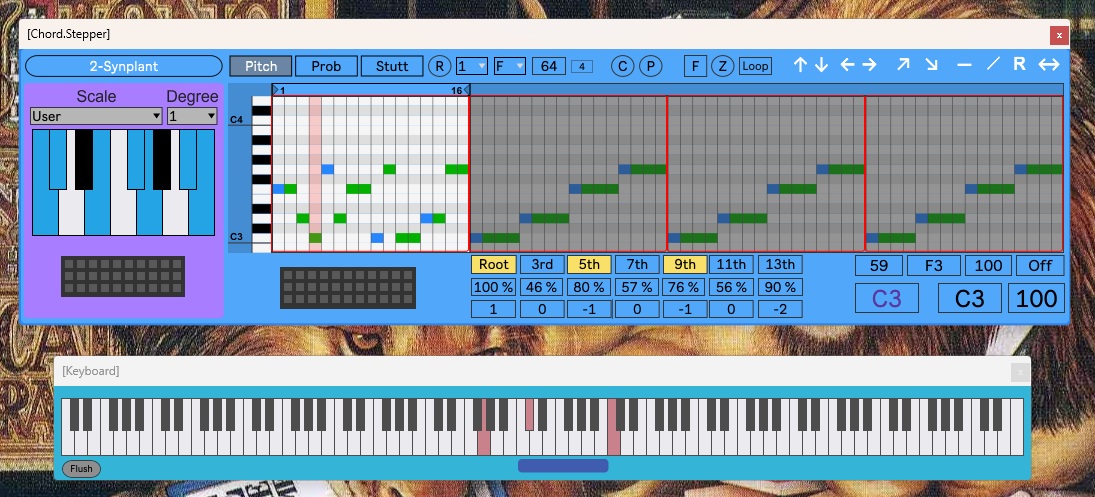 | Description: | This is a key driven chord sequencer with custom scales. Each incoming midi note (from a clip or keyboard) advances the steps. Notes can be as fast or as slow as you want, as long or as short as you want and as off-beat as you want. You can mix any of the Root, 3rd, 5th, ... 13th notes in. Each of these can be shifted up or down one or two octaves and each has adjustable velocity. There are forty built in scales and you can use the keys to make your own. If you want the track to be in the key of C, then just play the C key in whatever octave you want for that track. Basically, the key, velocity, octave, duration and timing are stored in the clip (or your playing), while this device manipulates the individual Pitches, Probability and Stutters (16n-64n). It has 10 Patterns Each of up to 64 steps Forward, Backward, For-Back direction Copy, Paste (within and between sequences), Zoom and Fold Separate Presets for the Scales and Sequencer Automatable Reset The " - " sets all the notes to C3, or all the Probs to Max, or all the Stutts to Off, depending on which view you are in. The " / " linearly lays out the Pitches starting from C1 until the end of the loop. Its useful for drum racks which usually start at C1. To Copy, move the loop ruler to where you want it and press C. Move the loop ruler on this or another sequence and press P to paste. The lower right displays mouseover information and below that is the incoming midi key and octave (in purple) along with the sequencer note and incoming velocity. Please let me know if there are any errors. There are so many ways that things can go wrong, its hard to test for all of them. Also, my music theory is extremely limited, so any pointers would be helpful. Share and Enjoy |