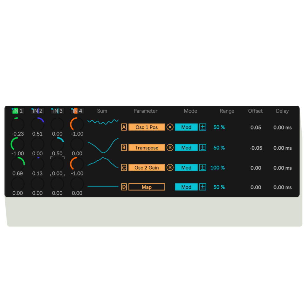 | Description: | QUAMOMI offers factoring and summing for up to four modulation sources within Ableton Live 12. It provides a matrix of 4 assignable inputs and 4 parameter-mappable output groups that offer 8 sub-destinations each. Each column receives a signal from its assigned source, each row outputs the sum of its sources. Each of the column/row-intersections ('nodes') is controlled by a dial that acts as an attenuverter, letting you close the node (value 0), open it (value 1), or flip it (value -1), and factor the input by all values in between. Additional per-destination Delay and Offset controls allow for phase shifting and range alignment, making QUAMOMI a flexible modulation hub for advanced Ableton Live 12+ workflows and Push 3 standalone setups. Video short demo: https://youtu.be/87UlcwJ9JvE |