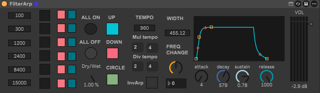 | Description: | Band-pass filter bank. Each band’s frequency is adjustable. Band width is adjustable. Up, Down, and Cycle arpeggio can run between the band frequencies, with envelope control. Pink and blue squares jump steps in the arpeggio. “Freq Change” (+/–) applies to all band frequencies. Tempo runs independently from the master tempo. Feel free to contact for any clarifications. |