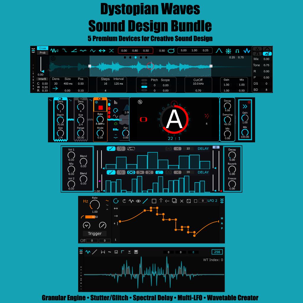 | Description: | Sound Design M4L Bundle — Granular, Glitch, Modulation, Spectral, and Wavetable Tools in One Collection The Sound Design M4L Bundle brings together five powerful Max for Live devices designed to expand your creative workflow inside Ableton Live. Whether you're crafting cinematic atmospheres, experimental textures, rhythmic chaos, deep modulation, or entirely new wavetables, this bundle gives you a full toolbox for modern sound design. Included Devices 🎛 Celium II — Granular Engine Transform any audio into evolving textures, shimmering pads, atmospheric swarms, and glitchy fragments. Celium II’s advanced grain controls and real-time modulation make it perfect for ambient, cinematic, and experimental sound design. ⚡ Drox II Pro — Stutter & Glitch Engine Create complex stutters, rhythmic cuts, tape-style stops, glitch bursts, and chaotic textures. Great on drums, vocals, FX, and anything needing movement or destruction. 🔁 Evorn — Multi-LFO Modulator A modular-style modulation engine with multiple LFOs, shapes, and routing options. Animate any parameter inside Ableton to bring life, motion, and evolving expression to your tracks. 🌌 Auren Pro — Spectral Delay A creative spectral processor capable of dreamy shimmer delays, frequency-split movement, ghostly resonances, and futuristic sound-sculpting. Perfect for atmospheric and experimental production. 🔷 WavEngine — Wavetable Creator Design custom wavetables from samples or generate them from scratch. Ideal for producers working with wavetable synths like Vital, Serum, Pigments, and Ableton’s own Wavetable device. A Complete Sound Design Toolkit for Ableton Users From granular clouds to glitch textures, spectral reflections, animated modulation, and custom wavetable creation — this bundle gives you everything needed to push sound beyond the ordinary. |