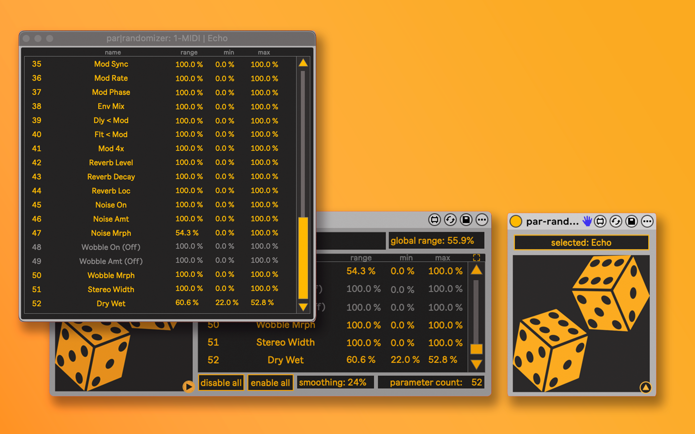 | Description: | Par|randomizer 2 looks much the same as its predecessor, but adds a lot of subtle extra functionality, making it much more of a powerful tool! Just like version 1, it's a Max4Live device that allows you to randomize the parameters of any device/plugin you map it to. But here's what's new: New Features: • intelligent randomization: randomization balanced around the current value, reducing bias towards center • Mappable global range control • Individual parameter range control • Individual parameter min & max control • parameter list with inline range, min & max editing • floating window for larger parameter list & controls • parameter smoothing for more subtle/moving effects. • retains parameters on re-mapping to device with same parameters (so you can retain parameters even when copy-pasting/duplicating par-randomizer 2 and mapped device, or remap to other instance of same device type without losing your settings) • Full path indication What was already there: • Full recall of all par-randomizer parameters • high performance, even with hundreds of parameters • map/ automate randomization • Possible to undo randomization • Comprehensive parameter list • disable/enable parameters • Full visual feedback about when parameters are not randomized • very fast workflow • simple disable/enable by disabling device So, lots of things there, from generating ever-moving glitch effects, to subtle movements, or just to click through & generate some surprising presets until you find something you like! You can view an awkward video where I try to showcase some of the features and uses here... I genuinely hope you find this device inspiring! Make some great music, and have some fun in the meantime! Cheers, Sander | Fluxwork Updates: v2.0.1 - 08-12-2025: - added support for Max 8/Ableton 11, probably below too. - fixed a bug limiting the maximum number of parameters to 127. It should go up to over 16.000 now, theoretically 😇 |