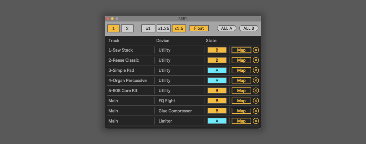 | Description: | ABBY is a Max for Live audio device that serves as a hub to control Live’s A/B comparison feature (Live 12.3+ only), which is a great way to compare mixing choices, or to compare audio effect, MIDI effect, or instrument settings. Features: - Map a total of 16 devices per instance of ABBY. - Floating resizable window, so you can control devices from anywhere in your set. - Switch between A/B states of individual devices using ABBY or change the states of all devices mapped to an instance of ABBY to A or B with one click. |