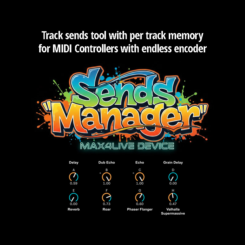 | Description: | Quick Start: 1. Drag the device onto an empty track. 2. Turn on MIDI Map Mode 3. Select the dials one by one twist an encoder on your MIDI controller to set them. Pro Tip: Select each track level controls one by one and map your MIDI sliders to those, which will automatically make that track the selected track for the device to automatically control that track, avoiding any manual track selections. You can also map any other buttons on your controller to the track title bar. This works great for me on my system. Take a few minutes to setup but worth it! Sends Manager is a Max for Live device designed to simplify per-track send control to Return effect tracks. Originally designed for the Akai APC40 mkII as it has 8 continuous encoders. I found no way to use my APC40 mkII to use the same encoders to control sends on different tracks as I could only MIDI map those knobs to one track. So I designed this Max4Live device to do just that. It has a built in memory of the send levels per track, so when you switch tracks, each send level is saved then recalled. The device provides dedicated controls for up to 8 sends on the currently selected track. You'll need to MIDI map the device dials to your MIDI controller knobs, which is pretty easy to do. Each send control is dynamically labeled using the name of its corresponding Return track. This was designed for any MIDI device with continuous encoders, preferably with an LED ring so you know where the last setting was. Once you map the MIDI encoders to the Sends Manager dials, you no longer need to look at your Ableton Live screen to see where you left the send levels. Some compatible MIDI controllers this should work with, which I think all have continuous (endless) encoders: Akai APC40 mkII (8 endless dials; Ableton-focused). Novation Launch Control XL 3 (24 endless encoders). Intech Studio Grid Series 3 DJ TechTools MIDI Fighter Twister (16 endless encoders, LED feedback). Faderfox EC4 (16 gridless push encoders, OLED feedback). OXI Instruments E16 (16 endless encoders with LED rings; newer option). Behringer BCF2000 (legacy, but has high-resolution encoders with LED rings). Novation Impulse (older keyboard line, but includes endless encoders). Thank you to Peter Nyboer, the MaxMSP God for helping me put this sucker together! -Brian |