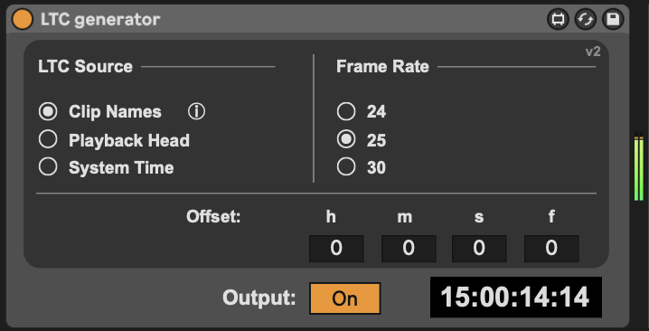 | Description: | This Max for Live device generates Linear Timecode (LTC) in real time inside Ableton Live, without the need for bulky pre-recorded LTC audio files. The generated timecode can be driven by: - Clips whose names specify timecode markers (for example: 2m15s, 5h, 15h25m30s15f) - The position of Live’s playback head - The system clock In modes 1 and 2, the device jams the timecode when playback starts and automatically retriggers whenever a jump in the timeline is detected. This guarantees a continuous and reliable LTC signal, even when looping or moving around in the Arrangement View. Important notes: - Because of Live API limitations, the device assumes a constant tempo while playing. BPM automation during playback is not supported. - For best results, set your audio buffer size between 32 and 128 samples. - Only non-drop-frame (NDF) frame rates are currently supported (29.97 fps is not yet available). |