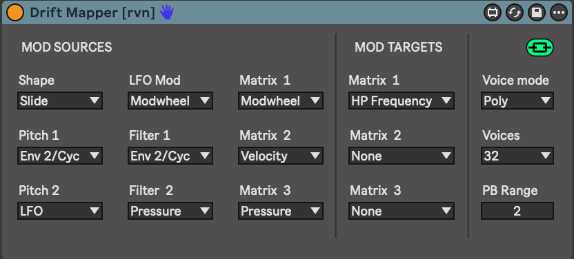 | Description: | A Drift companion device that allows MIDI mapping of modulation sources and targets, as well as a few other parameters that cannot be mapped in the Drift device itself. Linking Drift and this mapper occurs automatically when this mapper is dropped after Drift or Drift is dropped before this mapper. If automatic linking fails, a button can be used to manually connect. Compatible with Live versions 11.3 and later (Live Suite or Standard with Max for Live). |