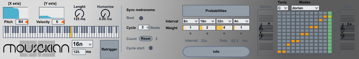 | Description: | mpMouseician handles midi notes and velocity values remote controlled by mouse movement. You just have to move your mouse up/down to control the velocity values, and left/right to control the piano roll pitch. This simple device manipulated by remote control, provides a means of melodic and rhythmic expression through movement. Start playback by clicking the Control Bar's Play button to syncro. LENGHT: determine the duration of all notes. HUMANIZE: move notes by time of the set quantization value. CYCLE: after how many pulses the value of interval change. RETRIGGER: enable to trigger the note when the mouse is stationary. PROBABILITIES: when enabled, the rate of triggering notes cease to be fixed to change based on the selected values of Interval and Weight. PITCH SCALE: alters incoming note pitch based on a scale mapping. INFO: help. Let me know if something doesn't work. If you have some ideas for make Mouseician better and more fun, please send me an email: manuelpalmablog@gmail.com Hope you like it. Cheers, Manuel Palma VIDEO DEMO http://manuelpalmablog.wordpress.com/mouseician |