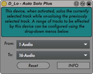 | Description: | This device solos the currently selected track while un-soloing the previously selected track. A range of tracks to be effected by this device can be configured using the devices drop down menus. This range is saved within your set. This device also automatically updates its drop-down menus to reflect both the number of tracks and track names in real-time. So, any time you add a track or change the name of a track, the menus automatically adjust themselves to show these changes. Also, if you add a track to your set that lies within your range, the range is augmented to compensate for this additional track. Moreover, tracks added to the set that lie before the range will offset the range by the number of tracks added. Enjoy responsibly! |