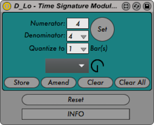 | Description: | This device provides a MIDI mappable control panel with which to creatively change the time signature(s) of your set. If youre the type of mad scientist who needs to switch from 7/4 to 6/8 and then to 11/16 on the fly, we at Bit Voltage have you covered. Drag this device into an Audio track to get started. Configure your desired time signature by manipulating the number box (numerator) and drop-down menu (denominator) at the top of the interface. Press the set button to trigger the change. This function is quantized to a user-determined number of bars. You can also compile and edit a list of time signatures in the secondary drop-down menu. Time signatures can be selected manually, or you can scroll through your time signatures using the dial to the right of the respective drop-down menu. Enjoy responsibly! |