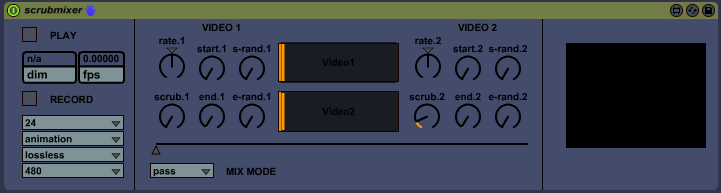 | Description: | Loop, mix, and scrub two quicktime videos. Drag a video to either of the black bars in the center (which also act as loop point and playhead viewers for either video). Control the loop points with START and END. S-RAND and E-RAND control how far either loop point will wander on each playthrough. SCRUB controls how grainy the START knob acts when scrubbing through the video (jumpy or relatively smooth). Crossfade with the long fader at the bottom and how the videos are combined with the MIX MODE menu. Quicktime videos can be recorded using the RECORD button, control size quality and codec using the menus below it. Mouse over the external video window and hit the escape key to go fullscreen, hit escape again to minimize. |