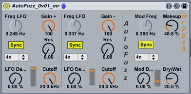 The distortion here is created by splitting the audio into positive and negative half cycles, and then amplifying, clipping and filtering those tow parts separately. This gives lots of control over how distortion is applied to the audio. Three LFOs provide control over the filtering and the wet/dry mix. |