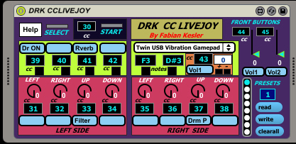 | Description: | DRK CCLIVEJOY IS A MIDI PLUGIN THAT COMPLETELY MAPS A STANDARD USB ANALOG JOYSTICK. IT CONVERTS COUPLES OF BUTTONS TO CONTINUOUS CONTROLLERS, ADDING SO MORE ANALOG CONTROL OPTIONS, SIMILAR TO THE VOLUME CONTROL OF THE TV REMOTE CONTROL. EACH LEVER HAS A MIDI CONTROLLER (LEFT, RIGHT, UP, DOWN) SO YOU HAVE FOUR CONTROLS PER LEVER. THE TWO FRONT BUTTON COUPLES ARE CONTINUOUS CONTROLLERS. (ONE BUTTON ADDS AND THE OTHER SUBSTRACTS) THE FOUR LEFT BUTTONS ARE ASSIGNED TO ON-OFF MIDI SWITCHES. THE FOUR RIGHT BUTTONS ARE ASSIGNED TO CONFIGURABLE MIDI NOTES. ALL SAVED IN THE PRESETS. THE "START" BUTTON IS A MIDI CONTROLLER OF "GATE TYPE". IF WORKS JUST WHEN YOU PRESS IT, IDEAL FOR SUDDEN / RHYTMYC CHANGES ON YOUR MUSIC. THE TWO LEVER PRESSES INCREASE/ DECREASE PRESET NUMBER. EACH PRESET STORES CONTROLLER NUMBER FOR EACH PART OF THE JOYSTICK (THE CC MIDI NUMBERS CAN BE CHANGED ON EACH BLACK NUMBER FIELD). YOU CAN OPEN, SAVE TO HARD DISK AND CLEAR THE PRESET BANKS WITH THE CORRESPONDING BUTTONS. STORE INDIVIDUAL PRESET BY SHIFT+CLICK ON EACH BUBBLE. SO YOU CAN COMPLETELY RECONFIGURE THE MIDI CONTROL NUMBERS WITH EACH PRESET, HAVING SO A LOT OF MIDI CONTROLLERS WITH JUST A CHEAP JOYSTICK VIDEO http://youtu.be/QcMCP2G6QQQ MORE VIDEOS, HELP, ABLETON TEMPLATE, MAX AND EXE VERSIONS HERE: http://fabiankesler.blogspot.com.ar/p/max-msp.html Author: Fabian Kesler - fvkesler@gmail.com |