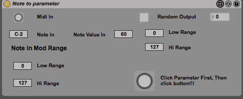 | Description: | Uses midi note pitch to modulate a single parameter. Has two modes: 1st mode directly translates midi note pitch from whatever sends midi to the channel. 2nd mode apply randomization on the modulation signal, creating a note-on randomizer. Modulation output values can be scaled. How To Use: Place Device in Midi Track Move parameter that will be modulated Press yellow button Send Midi to Note Pitch to Parameter Profit! It's recommended to use this just before a multimapper Note------- This is my first device, please feel free to make some changes and let me know what you do with it. -----Minor Update---- Included integer box that displays incoming midi note by name. -----New with v.1.0.2----- Midi notes will now pass through the device, making it possible to be placed on the same track as an instrument. |