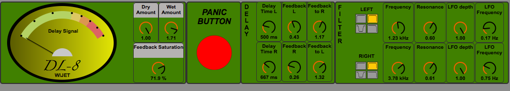 | Description: | Updated stereo delay with cross feedback, saturation, independent filters on Left and Right channels with LFOs. Create interesting delay based effects including dub type delays, saturated tape type delays, reverberations and sonic textures. A panic button is included incase feedback gets out of hand, this resets the feedback and resonance to 0. Speaking of feedback, feel free to leave any comments, improvements, criticisms etc... |
