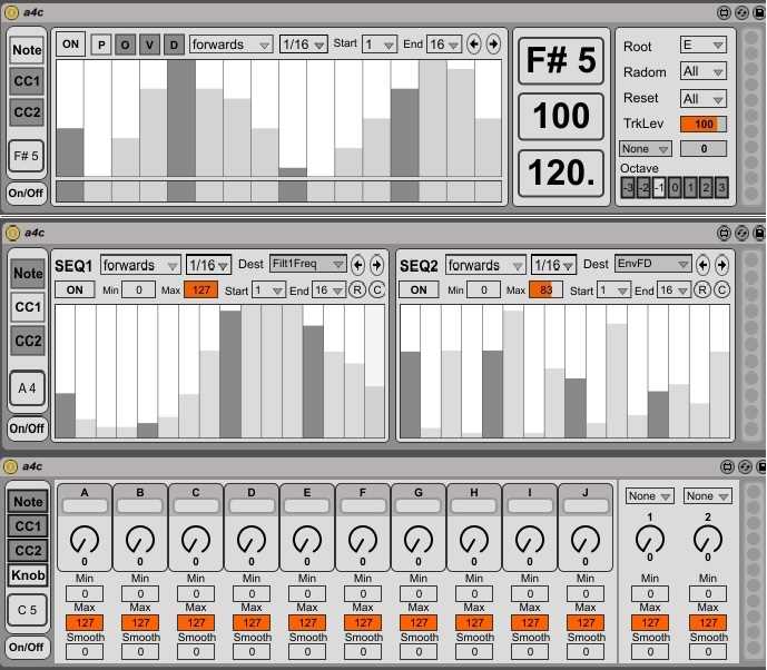 | Description: | for controlling elektron analog four This patch can control note and CC parameters. note sequencer P=pitch O=octave V=velocity D=duration cc sequencer min max=set the parameter range R=random C=clear v1.01 fixed few bugs v1.1 added swing parameter swing technique is based on the page below. http://monome.org/community/discussion/14226/swing-function-for-step-sequencer/p1 v1.2 added 10 knobs for performance parameter added 2 assignable knobs v1.21 fixed few bugs v1.22 fixed few issues |