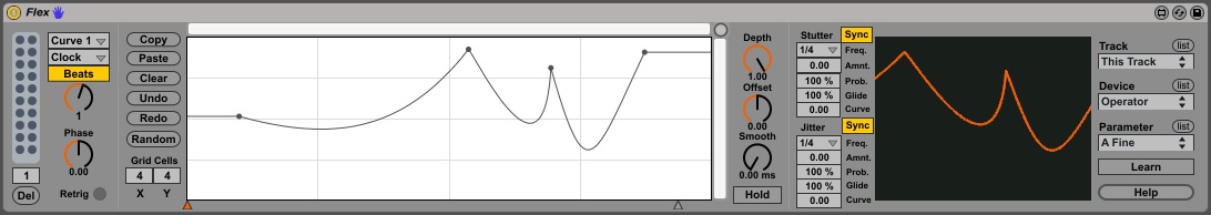 | Description: | Flex is something between an envelope generator and a LFO. Main features are: - Curve edition with bezier points, basic copy/paste and undo/redo - Can sync to Live's clock - Random curve generation and on the fly random modulations - Easy to store and recall presets - Scope for visual feedback of the output - Control signal "waveshaping" - In device help and tooltips Note that it is a Max audio device but doesn't produce or alter any audio, it is just a convenient way to be able to put the device on any track. Warning: The sa.function external this patch uses to draw the curves doesn't have 64 bits versions, so it won't work in 64 bits versions of Live. It works for 32 bits versions on a 64 bits OS though. This is early version, still considered as beta so there might be bugs, please send me any bug report at the email specified in the device's help page. Features suggestions are welcome too. Changelog: 0.2.18: Fixed an issue with min/max values of parameters. 0.2.17: First public release. |