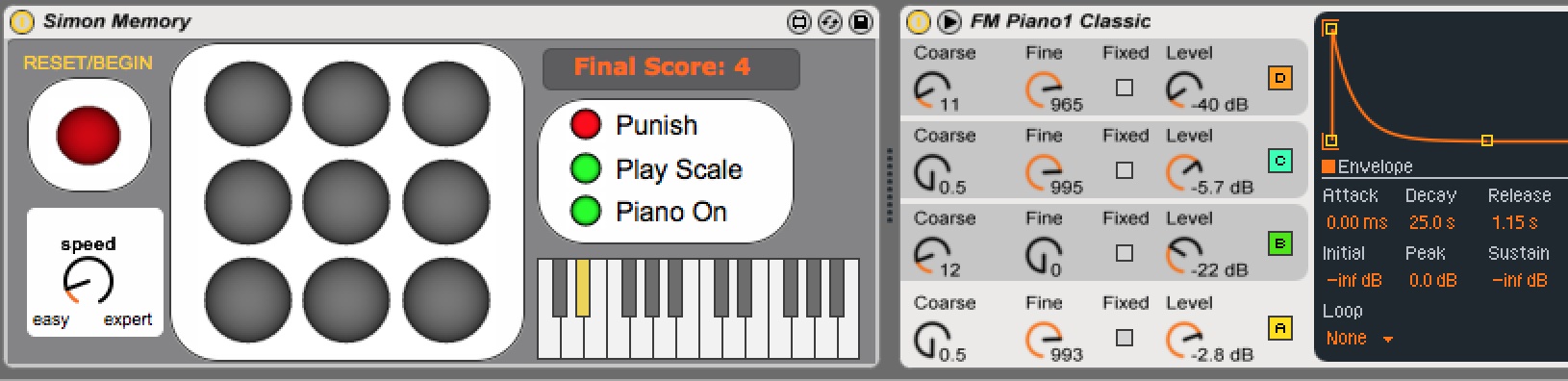 | Description: | Simon is an electronic game of memory skill training. Simon was launched in 1978 at Studio 54 in New York City and was an immediate success, becoming a pop culture symbol of the 1970s and 1980s. Simon Memory is a M4L device. Load it BEFORE an instrument. |