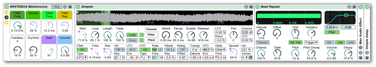 | Description: | FREE RACK. SIMPLER is loaded with Ableton's Limette sample then given an unpredictable Filter frequency, Spread, Glide Time, Filter Resonance and Loop Start with Max's Device Randomiser. Further processed with Beat Repeat (requires transport ON) and Simple Delay this is an intriguing if rather demanding sound creator. Drop ANY sample into it, of course. |