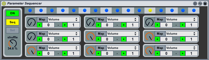 | Description: | This device lets you save snapshot of parameters on each step of a 16-step-sequencer. So when you hit play in Live, you get rhythmical changes of a parameter value. There is also a Note-Mode, which lets you trigger the snapshots via note-input. How it works: - Link one or all nine of the devices dials to any of lives parameters, by clicking on "Map" and then clicking the desired parameter in live. Set the parameters range (default 0 - 1). - Set the devices dials for your first snapshot. Shift + click on the desired step (grey dot) to save the snapshot on a certain beat. (this dot turns blue) - Do so for further beats/settings. If you leave one dot grey, the previous snapshot will stay until the next snapshot is recalled. - Set the Shuffle (Swing) amount. Note-Mode: - Set the devices dials as desired. Switch the device to Note-Mode (second button on the left side). - Make sure the device receives Midi notes (just like every other MIDI effect or Instrument) - Activate the "Set" button below, so that it turns green. - Press any key to link it to this snapshot. - Proceed this way with further notes/snapshots. - Works also with the Piano-Roll as note input. This is version 1.0 of the device. So I am sure there's room for improvement, so please let me know if you have any ideas! For feedback and suggestions: johann.niegl@hfmt-hamburg.de |