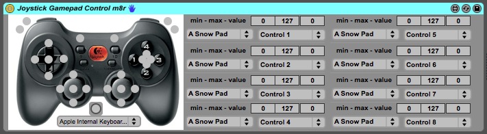 | Description: | Joystick Gamepad Control - m8r This plugin serves as a link between a gamepad and Ableton Live. Both joysticks are read out and give 4x128 step values (=4 directions) per joystick direction = 8 x 128 step values. The max4live plugin is opened in any track and can address up to 8 parameters in a set. In this case, it's a Logitech Cordless RumblePad 2 The input field selects the proper gamepad input The graphical overview to the left serves as a visual input indicator The Parameter Selector is used to select any plugin in a live set, plus its parameter Minimum and maximum range indicators help to adapt to the given parameter, the figure behind shows the actual value The plugin can be adapted easily to your needs, by opening it in Max4Live and tweaking its parameters. Parameters are reset by the upper front buttons of the gamepad. |