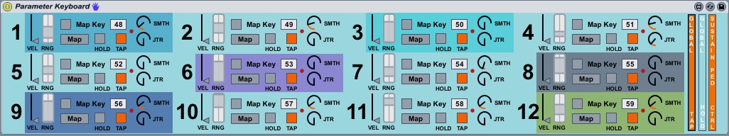 | Description: | This is a midi instrument, which is incredibly useful for arranging tracks, and doing some advanced fiddling with parameters using the keyboard. Assign your velocity-sensitive midi keys to parameters in live. It was built for the purpose of having many tracks playing in Live, assigning their volume to key velocity (with adjustable sensitivity and range), and then using the keyboard to bring parts in and out. However it can be assigned to any parameter, and be used for easy, intuitive hands-on control, adjusting parameters in fun and musically useful ways. Features include: -Map keys to 12 parameters total. Use more instances for more octaves. -Adjustable velocity sensitivity. -Adjustable value range. -Adjustable Smooth setting for fade-ins/outs -Adjustable Jitter function -Color-changing backgrounds behind the controls telling you which keys are being pressed. -Several options for freezing the parameter so you can let go of the key and keep playing, including: Tap on and off, "HOLD" toggle for each key and a global hold, and sustain pedal functionality. The Sustain pedal is mapped to control the global "Hold" function and works the same way. Press the key on with the pedal released, then press the pedal, then let go of the key, then let go of the pedal.. and the parameter will hold until you tap it off. Enjoy! Let me know what you think :) **** Updates: 12/14/13 - Changed max value slider to range slider. Added Smooth/Jitter. 12/15/13 - Updated to allow all parameters and key assignments to save with the project 12/16/13 - Added Color-changing backgrounds 12/31/13 - Added global hold, global tap, sustain pedal control, and fixed the issue of background colors sticking. **** Known Issues: None. Please let me know if there are problems, or if you have suggestions, in the comments section. |