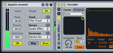 | Description: | In FLStudio there is an option, which automatically turns off effects that aren't used to save CPU. I made this device with the same intention. - Put it at the end of you effects chain. I recomend to put all of the chains effects into an effect rack. - Map the device to the "device on" button of the rack. - Set the Threshold of the Input detection. Now every time the output of the effects chain (which is the input of the device) falls below the set threshold, the effects rack is turned off and CPU is saved! - You can also set a "hold-time". This way the devices waits the set amount of ms to turn the effects rack off. Might be necessary when using delays e.g. You can also use it with synthesizers! For feedback and suggestions: johann.niegl@hfmt-hamburg.de |