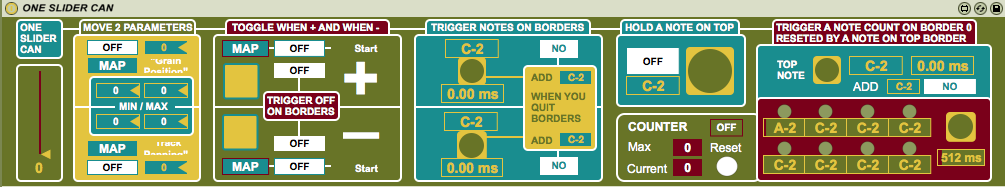 | Description: | One Slider Can is a didactic device which shows 5 ways to use a slider/knob. TUTORIAL First midi map a slider to ONE SLIDER CAN MOVE 2 PARAMETERS Map 2 parameters by clicking MAP and then the choosen parameter Choose MIN/MAX values TOGGLE WHEN +/- Map 2 parameters, they will toggle On or Off when you move your slider up or down Active Trigger Off On Borders if you want your parameters to be off when your slider is totally up or totally down TRIGGERS NOTES ON BORDERS Choose a note and a trigger time for triggering them each time you reach the top or bottom border time 0.00s = OFF You can optionally triggers a note with the same time when you quit the border. This note is the one just before the choosen one. (i will update this one day to be able to choose it too) HOLD A NOTE ON TOP Choose a note, you can trigger and hold it when you stay on top border. The note is stopped when you quit the top border. TRIGGER A NOTE COUNT Choose notes and times for your triggers time 0.00s = OFF Active the counter, set a Max value Now a note count (8 maximum) is triggered when you hit the bottom border, this count is reseted when you hit the top border You can also reset it manually Try it with Kicks and Hi-Hats on bottom and a snare on top ! Enjoy and share ! |