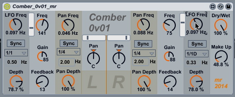| Description: | Comber is a pair of independent modulated delay-based comb filters that act on two stereo channels, and can then be auto-panned at the final mix stage - a stereo flanger is one way of describing it. To get the maximum flexibility in the filters, a gain stage is provided - take care with the Feedback control, and set the Gain and Make up controls to low values until you are happy that the filter is not going to self-oscillate. |