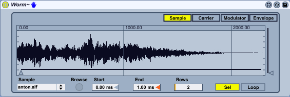 | Description: | Worm~ is a 64 voices polyphonic sampler/synthesizer based on 2d.wave~ (1) object with two multioscillator (sine, tri, saw, ramp, pw, noise) and envelope section. (1) 2d.wave~ is similar to wave~ (2), but with an additional axis. A given ms range of an audio file will be divided into n rows. Y phase input will determine which row(s) will be used for playback. Try loading a 16-bar loop and setting your rows to be 16 (or 7 for that matter). Try also using a short (150 ms or so) section of an audio file as a 2-d wave table. Set the phasor of one axis to be very fast, and one to be very slow. (2) wave~ reads from a portion of a buffer~ to produce a repeating waveform, given a signal input that goes between 0 and 1 (for example, using a phasor~ ) to define the position in the buffer. |