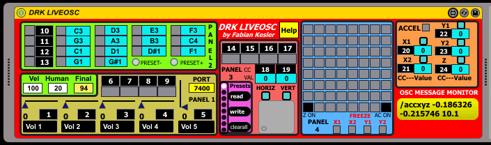 | Description: | DRK LIVEOSC is a midi plugin that converts your smartphone or tablet into a versatile controller inside Ableton as M4L plugin. There also MAX and stand-alone versions. This is by means of the OSC protocol via internal WIFI. There are some closed OSC-MIDI translators to use directly on Live or similar software without Max. But with Max in the flow, you can add lot of customization and features that are not included in a pre-made / closed-connection as you will see on the video and in the Help text. (PRESETS, ACCELEROMETERS FREEZING, ACCELEROMETERS TUNED TO 4 AXIS AS INDEPENDENT CONTROLLERS, MIDI NOTES PLAYING, ETC) And of course you can enhance this software as it is open. Version 1.1: Some maintenance and enhance aspects. VIDEO TUTORIAL: http://youtu.be/1NXTHrwaRts MORE VIDEOS http://youtu.be/qh7dgpTd9-0 http://youtu.be/a8SXYrjh7iA?list=UUpv0UswS6H-E35IYfjAbMHg https://www.youtube.com/watch?v=-vVuE45BJ8o&list=UUpv0UswS6H-E35IYfjAbMHg See the HELP box inside DRK software for details about using. More videos and plugins http://fabiankesler.blogspot.com.ar/p/max-msp.html The ZIP I leave in my page includes: M4L PLUGINS, HELP, ABLETON TEMPLATE, STAND ALONE (MXF) AND MAX VERSION. Please read READ FIRST document about the needs to make it work OK. Author: Fabian Kesler - fvkesler@gmail.com EMAIL: fvkesler@gmail.com WEB: www.fabiankesler.blogspot.com |