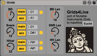 | Description: | Grids (http://mutable-instruments.net/modules/grids) is a topographic drum sequencer module from Mutable Instruments. This device is a port of the Eurorack version to M4L. Most of the original manual ( http://mutable-instruments.net/modules/grids/manual ) applies, with exception to of course cv inputs, clock in, tap tempo and such thing which do not make sense in a DAW. Make sure to automate the parameters with automation or with a max4live LFO, that is where the fun begins! - Compatible and tested with m1 macs - Compatible with Ableton Push (not in standlone mode tough). Push supported based on https://www.maxforlive.com/library/device/9793/grids-4-push License : released under GPL 3.0 |