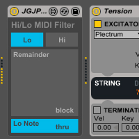 | Description: | This Max for Live device allows you to process MIDI streams and separate out the lowest or highest note out of several simultaneously held notes. The Hi/Lo switch allows you to choose whether to separate the highest note or lowest note and the interface will change to reflect this. The 2 big buttons labeled Remainder and Lo Note/Hi Note allow you to toggle the throughput allowing 6 possibilities: All notes thru Highest note only All notes except the highest note Lowest note only All notes except the lowest note No notes thru |