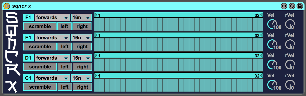 | Description: | sqncr x is a simple four channel sequencer that feeds into Live's drum rack, the notes as indicated on the left of the device. It's main function is to create drum clips quickly and easily. Steps are controlled with a probability slider and each channel's length, timing interval, playback direction, and velocity can be independently set. When you first load sqncr x all channels are turned on, and all steps are turned off. Here is a workflow example: 1. Set the length of a sequence by using the slider above the steps. 2. Draw in the number of notes you want, and their probability of playback. 3. Click the scramble button until you get a pattern you like. 4. Repeat this process for the other three channels. 5. Use the left and right buttons to fine tune the sequences and their relation to one another. 6. Use the playback direction, timing interval menus, as well as the velocity dials for added variation. 7. Record a clip. 8. Vary the sequences. 9. Record another clip. And so on and so forth. You can also simply draw in notes and probability exactly the way you want for any or all of the channels. A few other notes: I've run into a bug where if you load it into a Live project then close that project without using sqncr x, when you load the Live project again sqncr x won't run correctly. In this instance just delete it from your Live project and add it again. I have found that if you use any other time signature besides 4/4 you may run into problems. I could not determine the reason why. I did not name any of the elements (so that they show up in Live's menu for things like automation) because when I did it caused the device to not play back correctly. Being very new to Max for Live I could not figure out the problem. So just consider using this sequencer for quick and easy clip creation, and not much else. VERSION 1.1 uploaded February 23, 2015 -Set the velocity to 100 rather than 127. 100 is the standard velocity when using a computer keyboard to test sounds, so having the velocity at 127 would sometimes result in a different sound than what you hear when testing sounds. -Changed the note output to C1, D1, E1, F1 to align with A, S, D, F on a computer keyboard. This makes it easier to test sounds. The C1, C#1, D1, D#1 output aligned with A,W, S, E on a computer keyboard making it awkward. -All channels are now on when loading the device, and can be turned off by clicking on the note indicator. -Removed the random button, as it was more or less useless and only took up space. VERSION 1.2 uploaded March 3, 2015 -Added dials to control velocity. -Added dials to control randomization of velocity. VERSION 1.3 uploaded March 4, 2015 -Added dials to control humanization. -Uploaded a 16 step version: http://www.maxforlive.com/library/device/2864/sqncr-x16 VERSION 1.4 uploaded May 4th, 2015 -Unplugged humanization dials as they were causing problems. To add humanization to your clips I suggest using the groove feature in Ableton Live. |