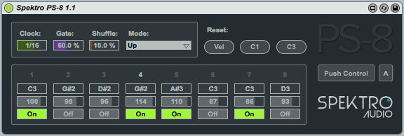 | Description: | 8-step analog-style sequencer for the Ableton Push inspired by analog sequencers such as the Korg SQ-10 and Moog 960 Sequential Controller. PS-8 is great for live performance and improvisation. The main difference between PS-8 and other Push sequencers is that it uses the Push encoders to change the pitch / velocity of the eight steps and rows of pads to control other parameters such as gate length, shuffle amount and direction. Video demo: http://youtu.be/ajxvSvpdF0M Since PS-8 uses custom controls for the Push, you must activate the Push Control button after loading the device. While active, Push Control will overwrite some of the Push controls / functions. You can turn Push Control off at anytime by clicking on the Exit red button available on the top-left corner of the grid (Select button #1). By default, the eight encoders control the pitch of the steps. In order to use the encoders to control the velocity of the steps, hold down the orange button available on the top-right corner of the grid (Select button #8). This is a momentary switch so you must keep holding the button down while changing the velocity of the steps. Whenever you touch one of the encoders, the respective control on the main GUI will light up in order to provide visual feedback. The first row of pads (green) lets you switch steps on and off. The 2nd row (also green) displays the position of the step sequencer. You can also click on any of the pads in this row to jump to a specific position. Rows 5 (purple), 6 (orange) and 7 (light blue) control gate length, shuffle amount, and mode respectively. The speed / rate of the clock can be controlled using the Push Scene / Grid buttons. Current limitations: - The pitch, velocity and state of the steps can only be controlled using the Push. - Since PS-8 was designed to be used for live performance, the pitch and velocity of all the steps will be set to C3 / 100 whenever the device gets loaded (meaning you won't be able to store sequences within projects). It's possible, however, to record MIDI sequences by routing the output of the PS-8 to a different MIDI track. - The 2nd row (green) can only be used to jump to different positions when the sequencer is set to Mode 1 (Up) or 2 (Down). PS-8 is developed by Spektro Audio. Check out our MaxforLive devices at http://spektroaudio.com/projects PS-8 uses modified / adapted parts from the Ableton Push Development Kit originally developed by Florian Zand. --- Changelog: 1.1: - New Push Control modes: In A (Auto) mode, you can activate Push Control using the Push In and Out buttons while the device is selected. M (Manual) mode lets you manually control Push Control using the button (like the previous version). I believe this will vastly improve the PS-8 workflow. Let me know if you find any bugs. 1.0: - Initial Release |