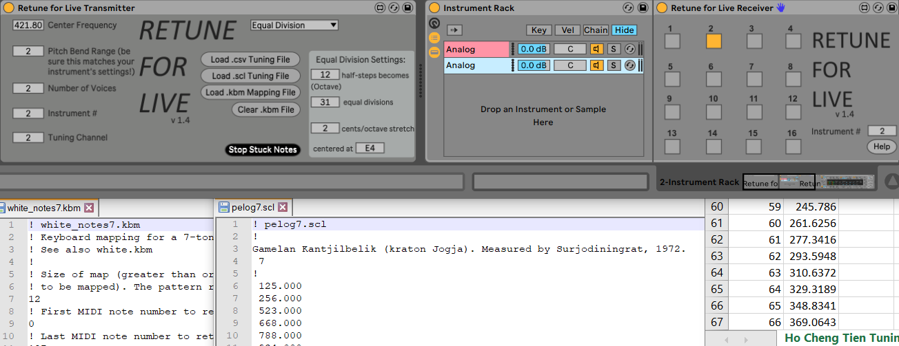 Hey man, I love this device. I'm willing to pay you for it if you can fix 2 things: first off, loading a project does not load the tuning file you were using when you saved and closed the project, If could fix this that'd be awesome. Second, When you load the device in a project it has a little glitch that makes it work perfectly!... Until you press play. What it does is allow you to route all of your recieves to 1 instrument. Which I realize isn't perfect, cause when you are holding a note and hit another one it slightly changes the first one, but it works well enough for when you are doing sound design which having multiple instances of your instrument is a nightmare for. Or if you know another way to use this device polyphonically only using 1 instance of an instrument, that'd work too. If you are confused about my question, email me here: dhcracchiolo@yahoo.com