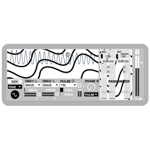 | Description: | DRONEPULSE is an audio effect that allows you to generate oscillations with seven signal types (Sin, Phasor, Tri, Rect, Saw, Pink & White). Two oscillators are available and a third one modulate them to create pulse effects. Randomizers are included and can be applied to signal generators. DRONEPULSE helps you to easily create simple pulsating sounds (from 10 ms to 30 seconds period), heavy shaking drones, groovy synced basslines (with the quantize mode), or experimental random frequencies. #Linear / Pulse Mode Linear will make work Osc1 and Osc2 to generate linear signal. Pulse will introduce a third oscillator to modulate 1 and 2 and create pulsation. #Oscillators 1 & 2 Simply choose the signal you want to generate and the frequency. Frequencies are from 1 to 10.000 Hz. Use the gain to mix the two signals. #Pulse Choose the signal you want for modulation. You can set the pulse's period from 10 ms to 30 seconds, or from 1 to 128 bars (relative to the project's tempo). #Signal Types Seven signals are available for each oscillator : Sinusoidal, Phasor, Triangle, Rectangle, Sawtooth, Pink Noise, White Noise. #Phase Adjust the phase for all signals to correct the sync in the quantized mode. #Free / Quantized Mode Choose the mode to start the signal. Free Mode allows you to start the signal when you want. In quantized mode the Ableton Live's global transport has to be launched. #Randomizers #1 Allows you to generate random periods values for the Pulse. In "RANDb" mode a new random bar value is triggered at each step. In "RANDs" it's a "time" value. Values will be picked up randomly into their respective ranges depending on the Mode. Steps that trigger the random choice are generated at a tempo you can set. Steps are starting when clicking on the device's general Start button. At this moment the upper and lower leds will begin to blink, indicating each step. A random delay can be introduce to create more randomness. In this case the lower led will blink at each step + a random time picked up in a range between 0 ms and the entered value (max. 3 seconds) and indicate the moment when a new random value is chosen. #2 Same way for the 2nd randomizer. In this case it applies to the Oscillator2 frequency. #Oscilloscope Buffer & Gain Change the Buffer and Gain of the oscilloscope to adjust signal displayed by moving the cursor in the X and Y directions. ______________________________________________________ A video about this device : https://www.youtube.com/watch?v=e8nL0rubM8M ______________________________________________________ For more information please visit : http://flo.szk.fr/m4l/ |