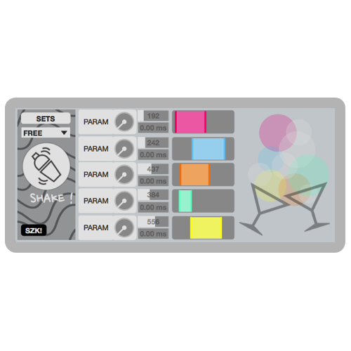 | Description: | Shaker allows you to grip'n shake Live's parameters. Link parameters to knobs and automatic change their values randomly to create automated variations, from fine modulations to total chaotic strange sounds. Shaking ! One Shaker can grip up to 5 parameters. On a same Shaker you can grip any parameters located on different places of your Live set. Use many Shaker for complex configurations ! #Grip parameters (+ Midi mapping) Click the "Set" button on the top-left area. Lock/Unlock will appear over the knob. Proceed one by one (IMPORTANT) : 1# Unlock (button turns green). 2# Click on parameter somewhere on your live set (parameters can be those on other tracks). 3# Once gripped, the parameter's name appears. 4# Re-lock (button turns red). Reset param : same than gripping, but click on button itself. Midi mapping : map the red knob. #Shake Button Hit the button to launch the shaker. You can choose between Free or Quantized. If Quantized, the shaker will launch only if the Live's global transport is playing. #Random Steps Random steps start with the shake button. For each knob you can set a bpm at which random values will be picked. You can introduce more randomness with an additional delay range. If so, random values will be chosen at each bpm's step + a random delay picked between 0 ms and the entered value. #Slider / Random Range Click to define the min and max of the random range. At each bpm's step a random value will be picked into this interval. #Leds / Bubbles Leds are blinking at bpm's step and indicate that a new random value is chosen. Colors refer to their respective knobs. Gray ones indicate the picking when an additional delay is introduced. ______________________________________________________ A video about this device : https://www.youtube.com/watch?v=w07gGwtxFmc ______________________________________________________ For more information please visit : http://flo.szk.fr/m4l/ |