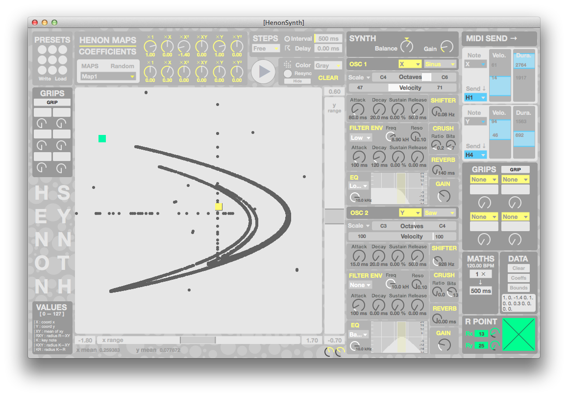 Description: HENONSYNTH is a complex multi-purpose Synth Instrument and Effect/Modulator based on strange attractor's quadratic mapping. The synth’s algorithm generates a quasi-unlimited quantity of strange attractors that allow you to control different modules and to combine them. Three Modules are available : 1# a 2x Oscillators Synthetizer, 2# a MIDI Sender and 3# an Ableton Live API’s Controler. Calculated values from the quadratic system are used to feed these Modules to create a wide range of auto-generated sounds.